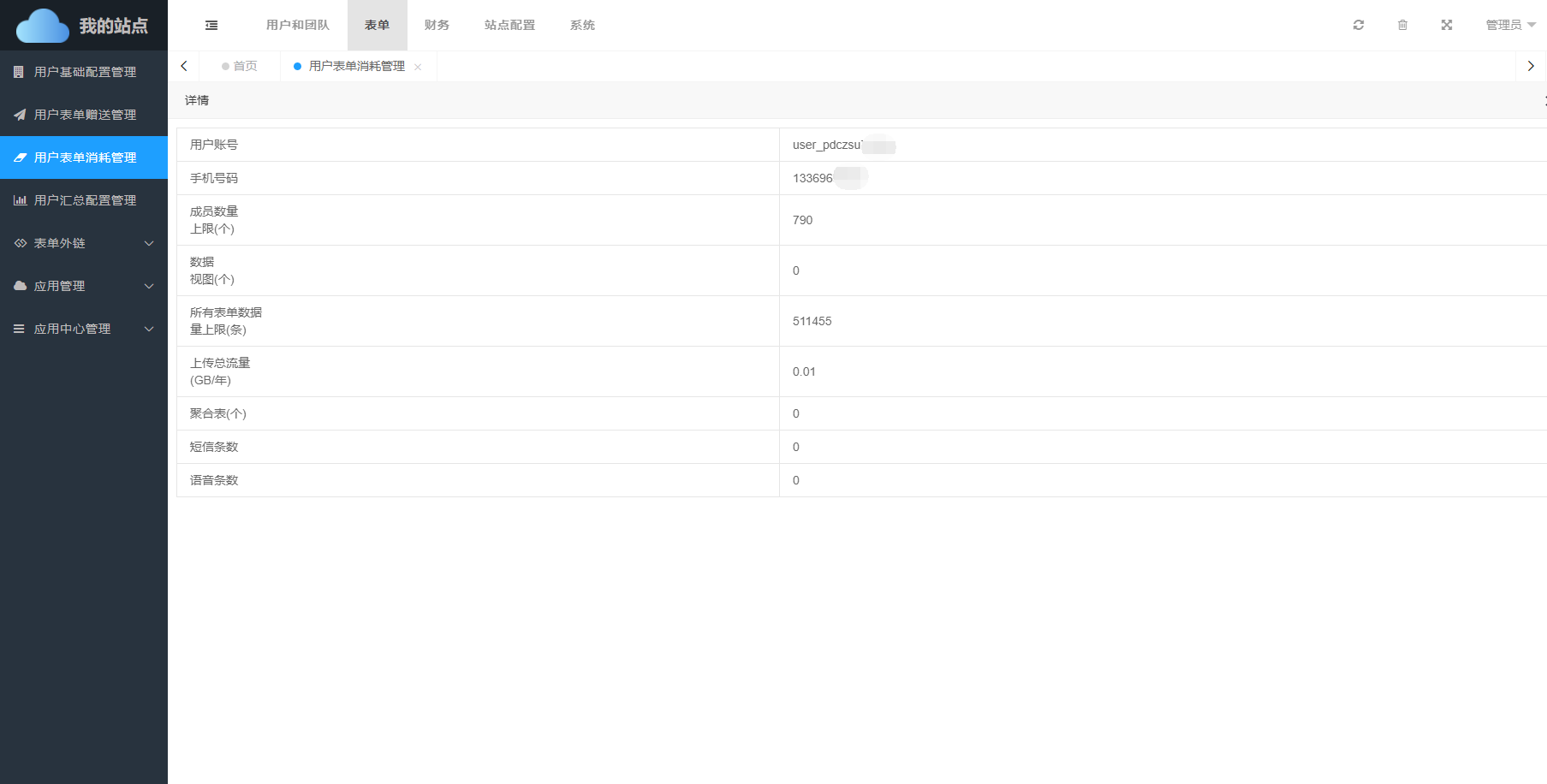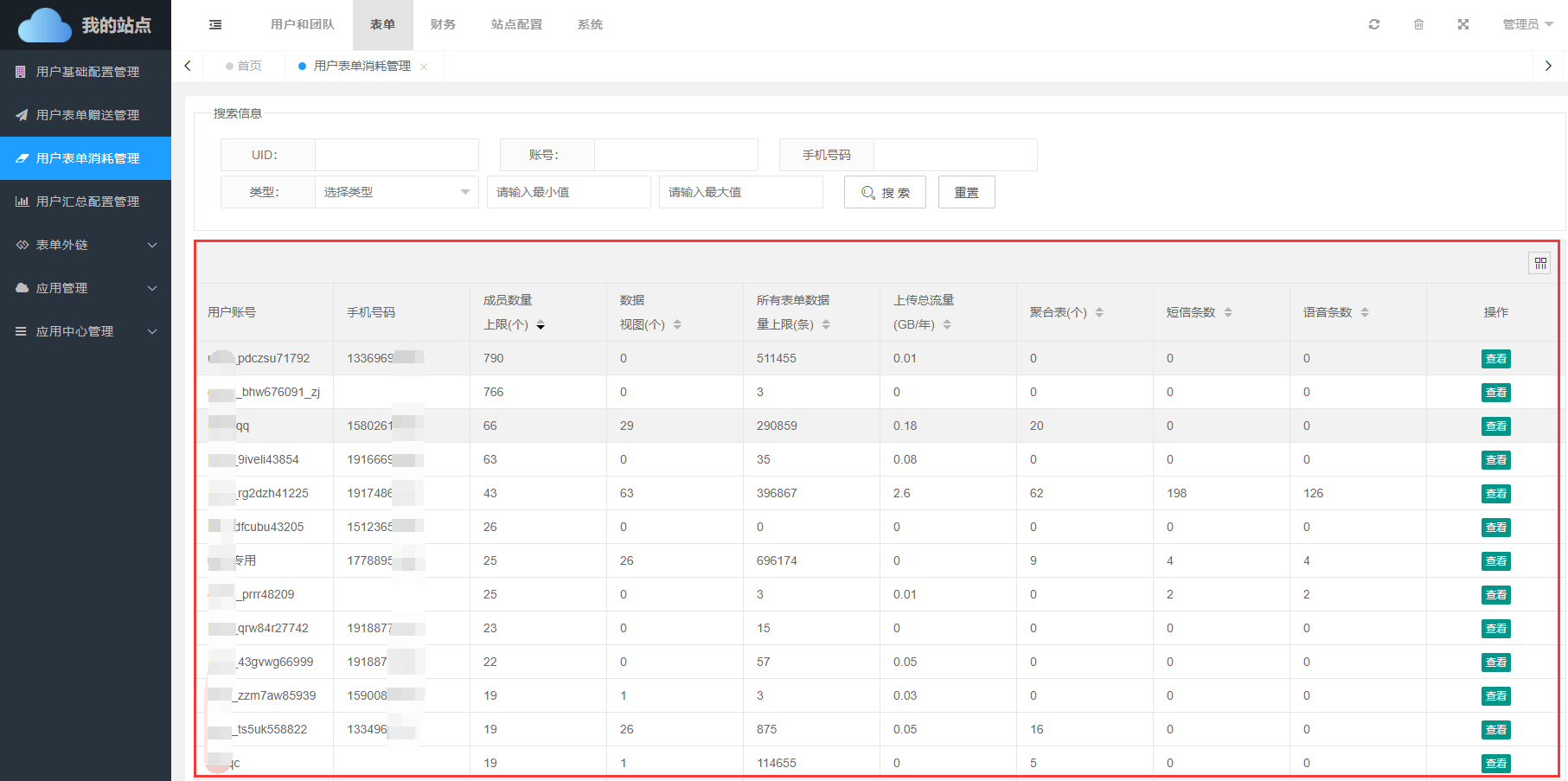 用户表单消耗管理页面显示每一个用户对系统的配置消耗。