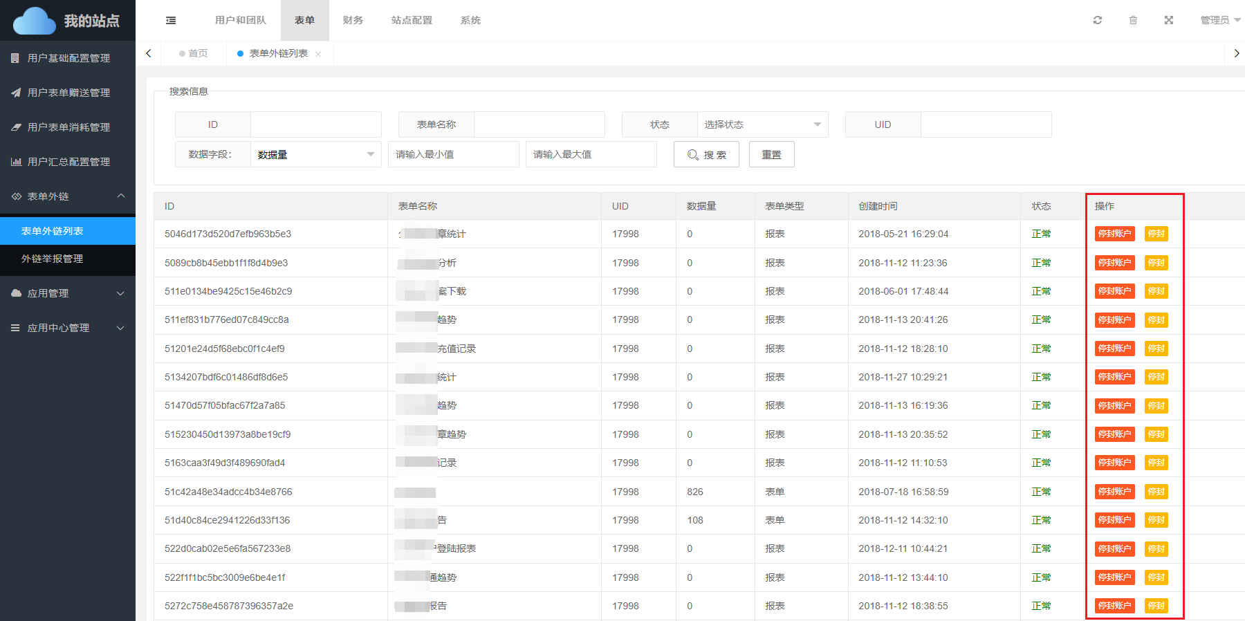 表单外链列表中,展示所有已发布的表单以及开启的外链列表,在这个列表中,可以对所有外链进行集中管理