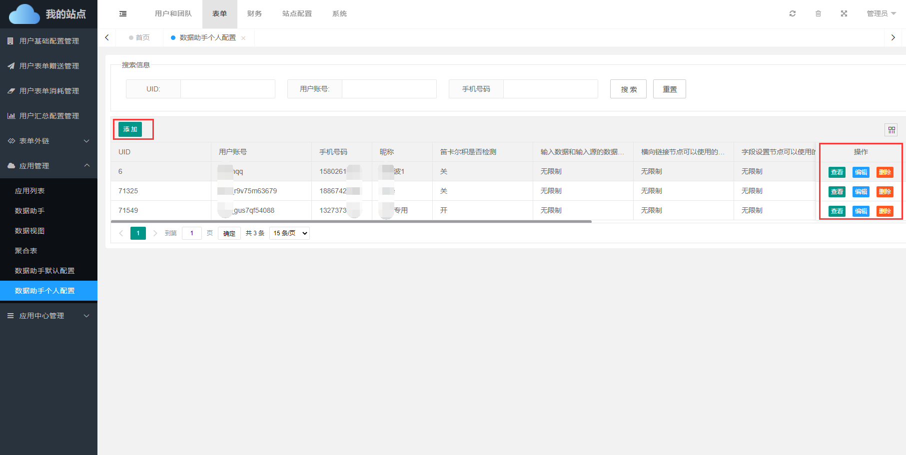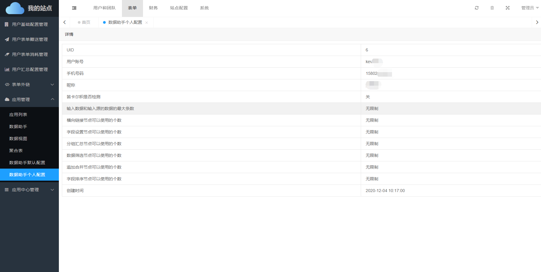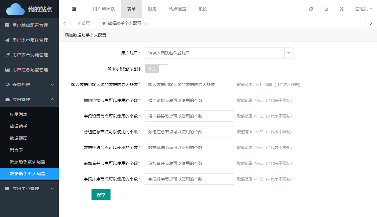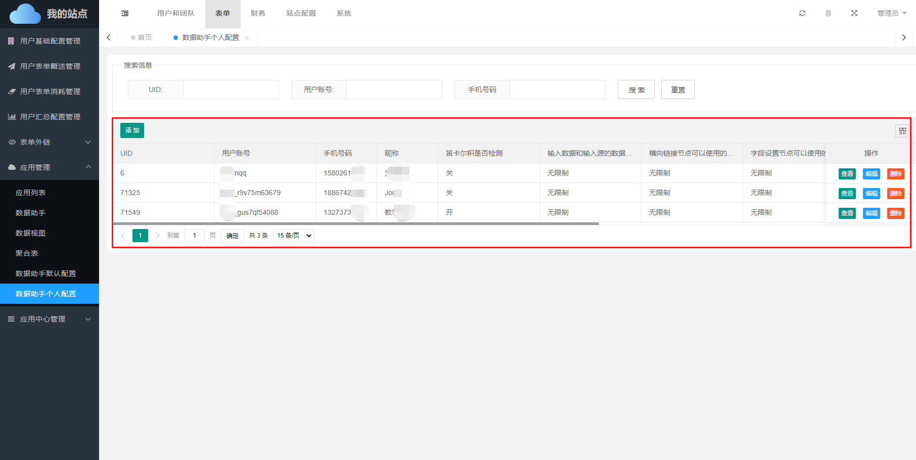 数据助手的配置分为默认配置和用户个人设置,如存在个人配置,则用户的配置数量按照个人配置执行,在个人配置列表中,可以查看每一个用户的配置信息,并且可以添加、编辑、查看和删除配置。