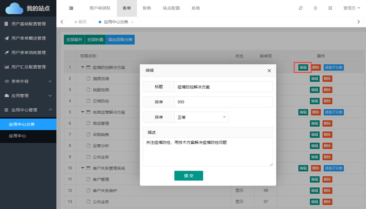 被添加的顶级分类和子分类都可以进行编辑操作,可编辑的信息和添加时一致。