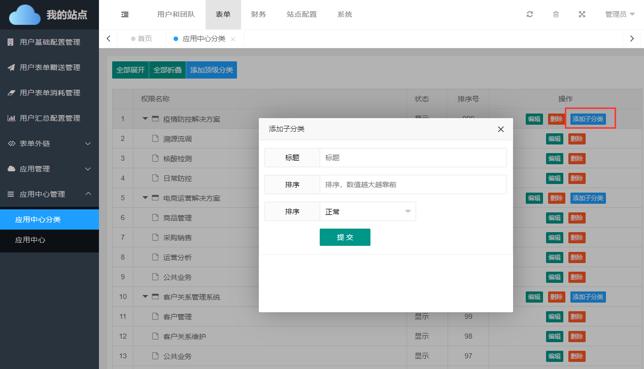 只有顶级分类可以添加子分类,添加子分类的方式和添加顶级分类类似,添加后的子分类,会出现在对应的顶级分类下。
