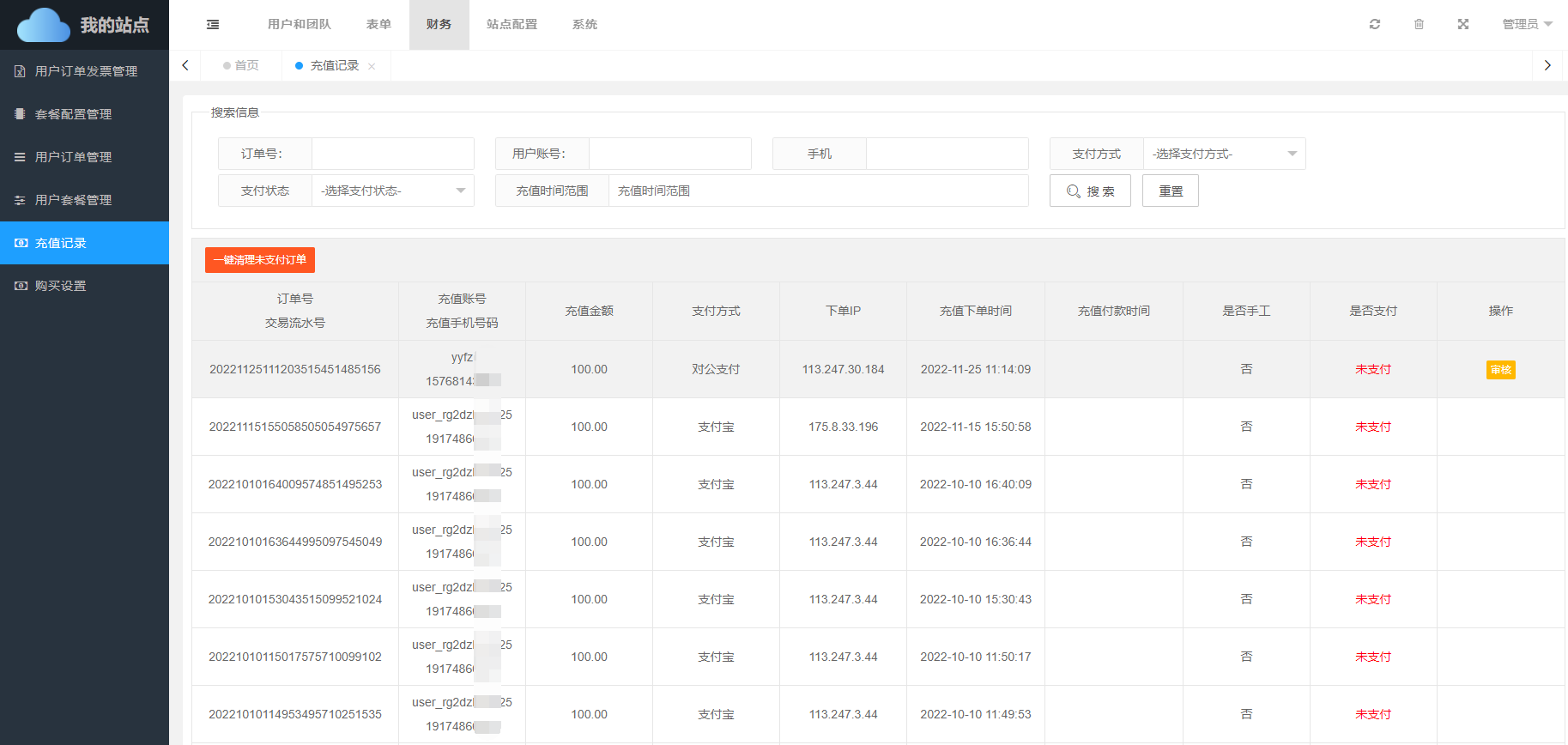 用户所提交的充值请求列表,可以查看到用户支付的具体信息,对于对公支付,还可进行①审核,对于长时间未支付的订单,还可进行②一键清理的操作。