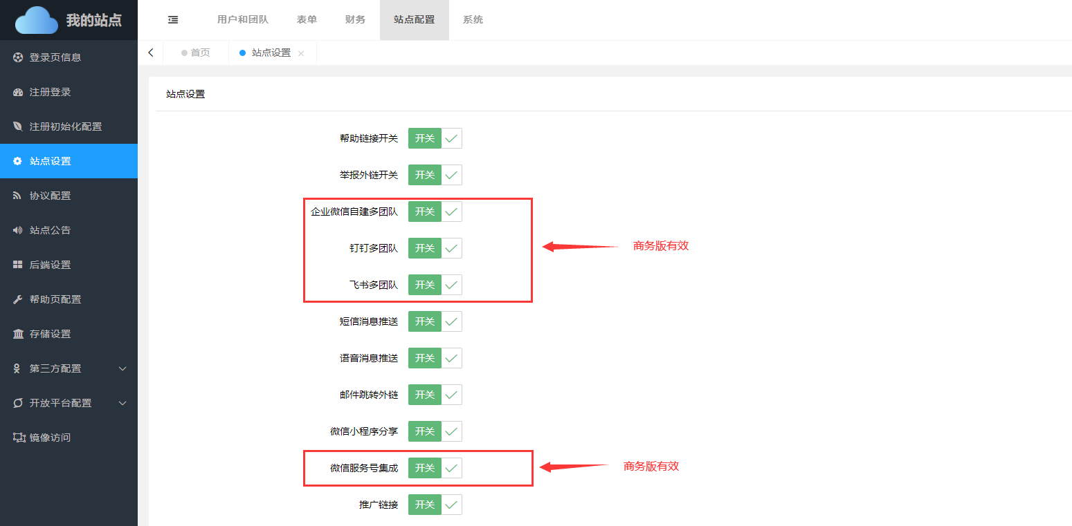 站点设置主要是对站点功能开关的设置,通过本页面可以对部分站点所涉及的功能进行开关和设置。