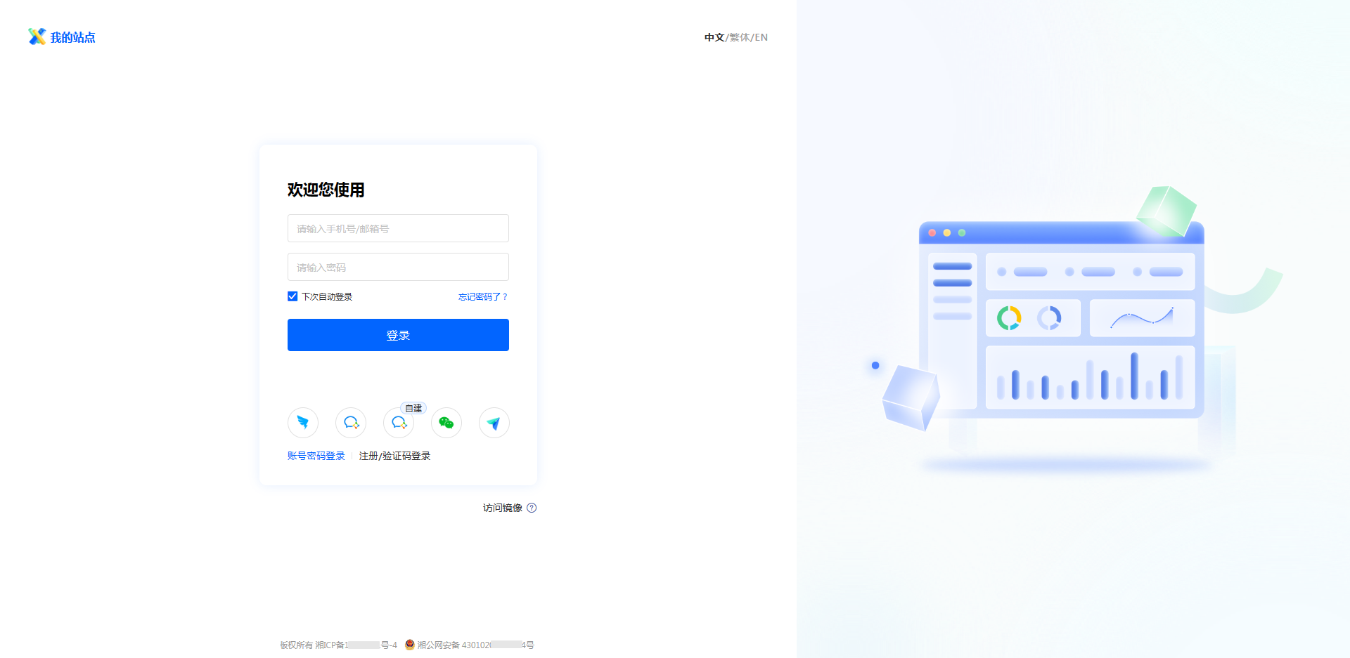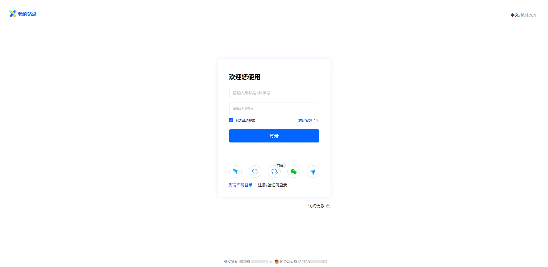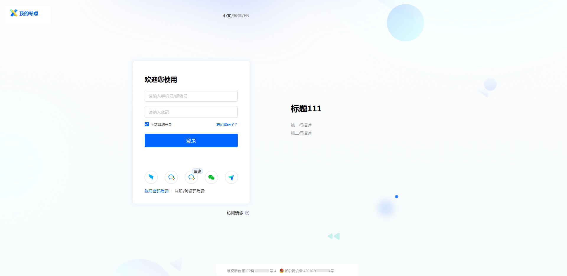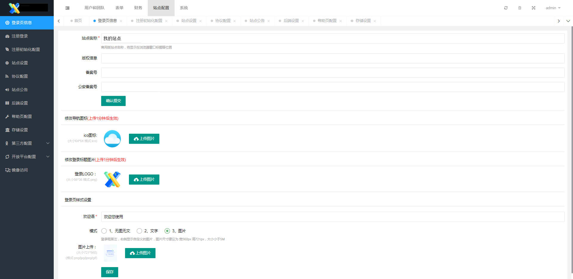 登录页信息主要设置和登录页面有关的内容,在此页面可进行站点名称、导航图标、登录页文案等和登录页有关的设置。