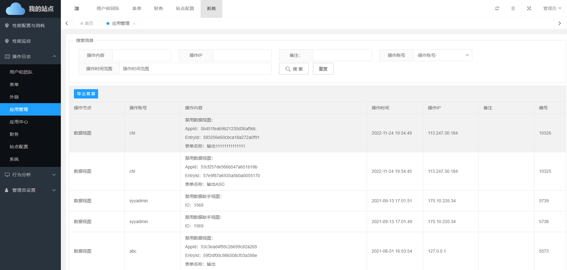 管理员可以对应用的数据视图、数据助手进行启用和禁用,其操作记录会记录在应用管理日志当中。