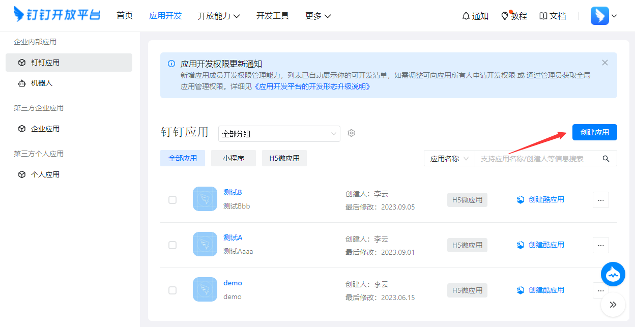 访问(https://open-dev.dingtalk.com/v2/fe/app#/corp/app)