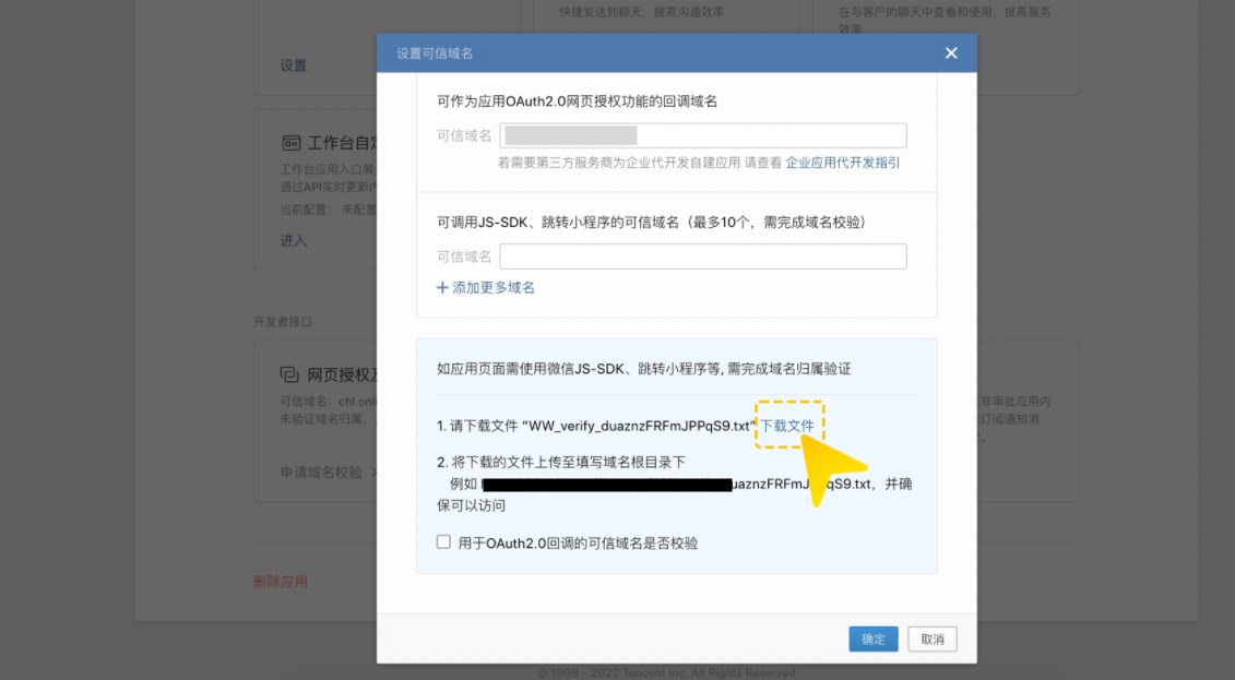 2、粘贴至 企业微信 的网页授权及JS-SDK,点击设置可信域名