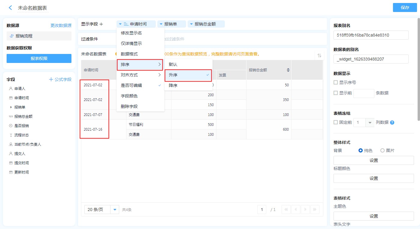 在报销管理中,需要按照申请报销时间进行升序排列。