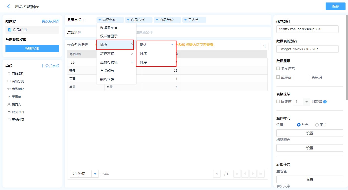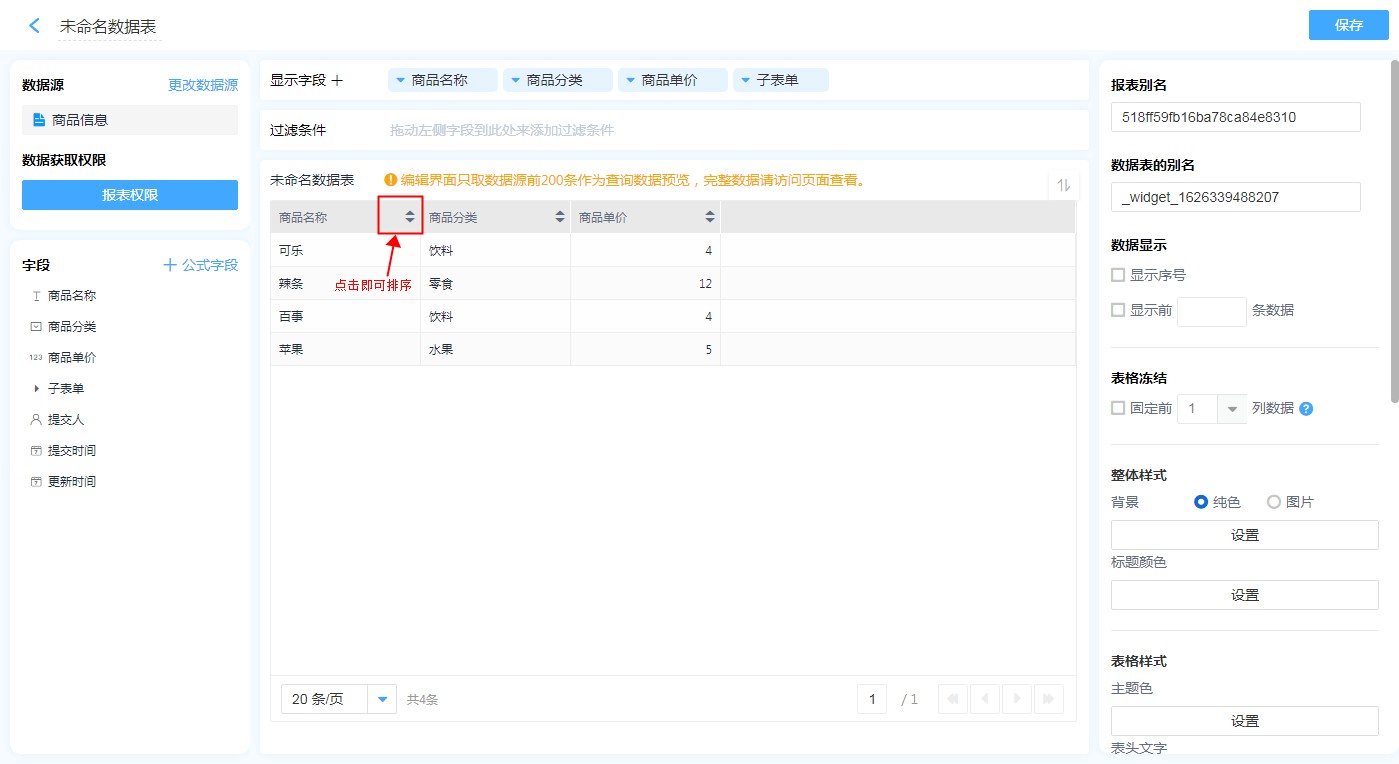 (2)点击 【图表数据展示区】字段列表头快捷地给对应字段设置排序。