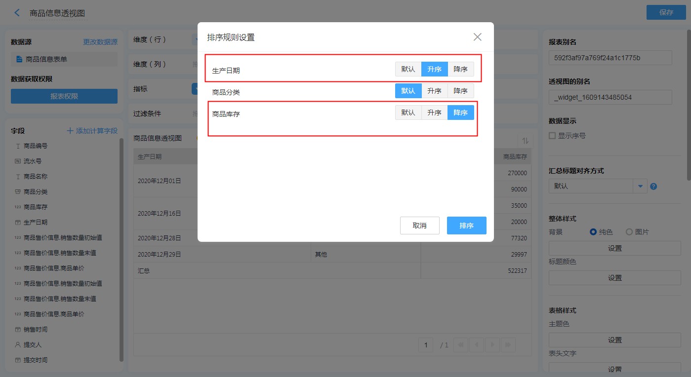 商品管理中,需要按照生产日期进行升序排列,同时,也需要对同一生产日期下的不同分类下的商品库存进行降序排列。