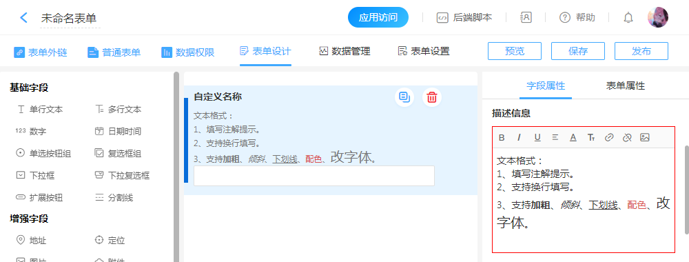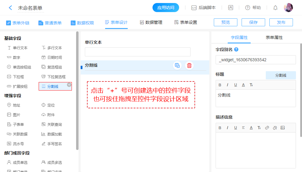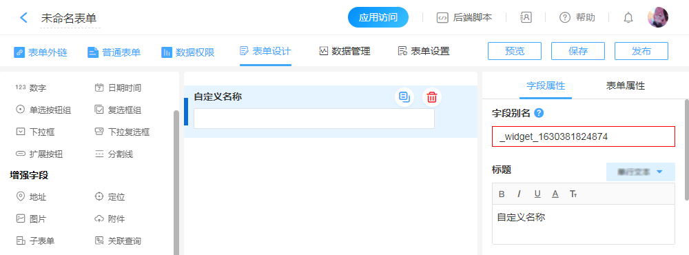 “字段别名”用于后端开发,默认为系统自动生成的随机字符串,可修改。