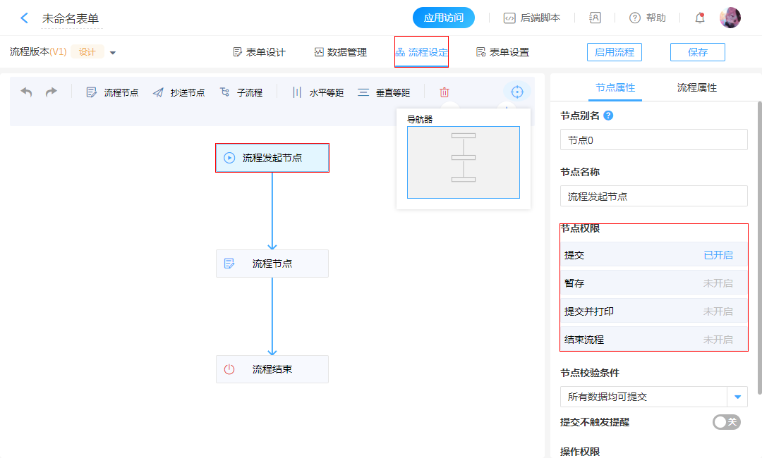 • 流程表:在流程设定的节点权限所配置数据助手、功能插件、后端事件中所拥有的属性功能。