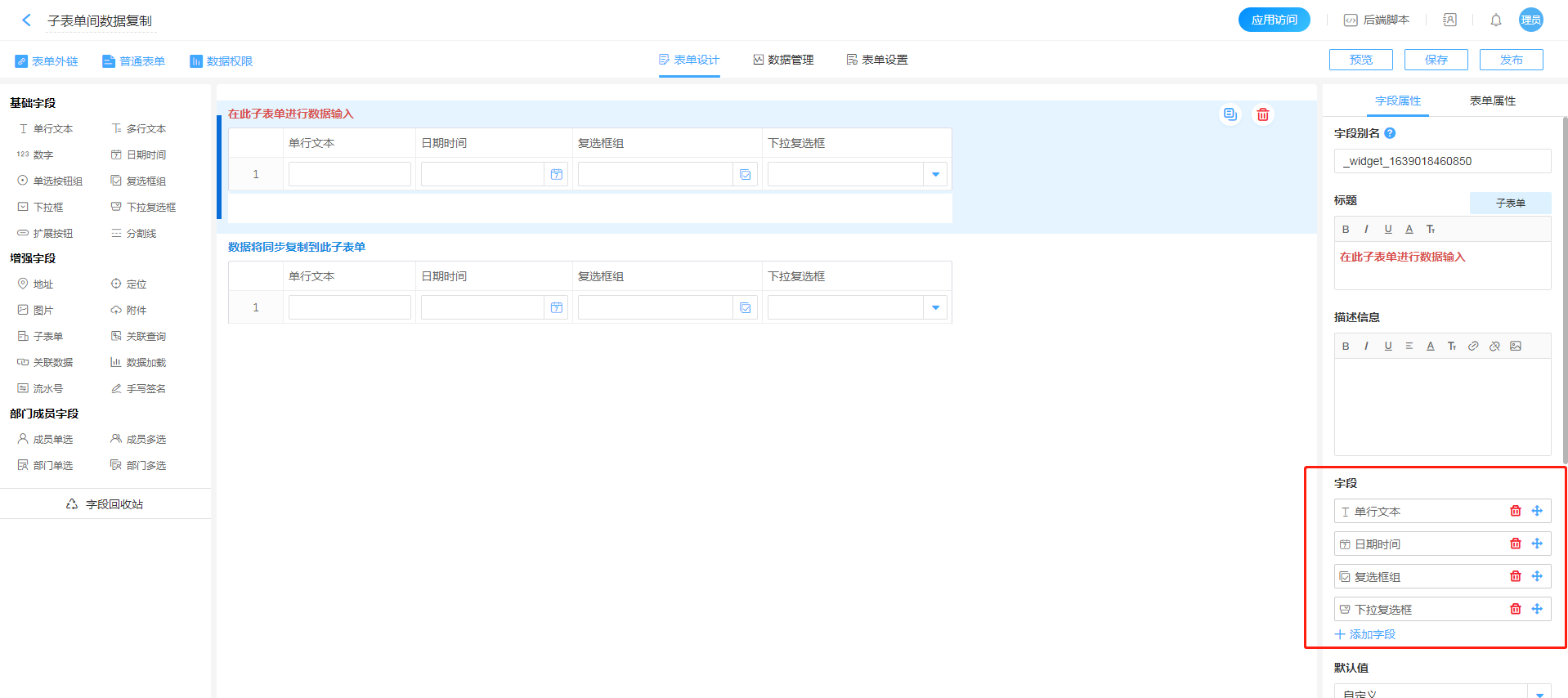 1. 输入数据选择输入数据,并讲子表单与普通字段进行区分。