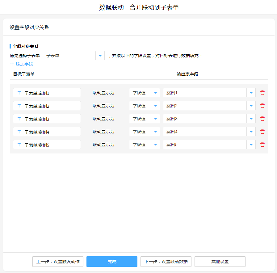 1. 新增执行动作数据联动,操作模式按照实际情况进行选择,关联字段联动关系
