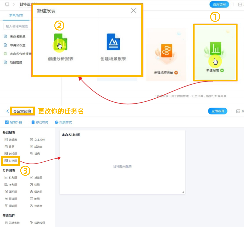 将刚刚设计的表单添加至数据源后,可以设置任务:【维度】&【开始时间】&【结束时间】(精度设置小时、日、月,能清晰展示每个任务历时长短) 【显示字段】、【过滤条件】(对于进行中的任务,可以通过过滤条件筛选出需要统计的数据)