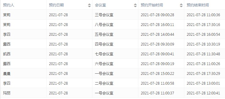 设计如图所示的会议室预约表单,发布给成员填报表单来进行会议室预约。