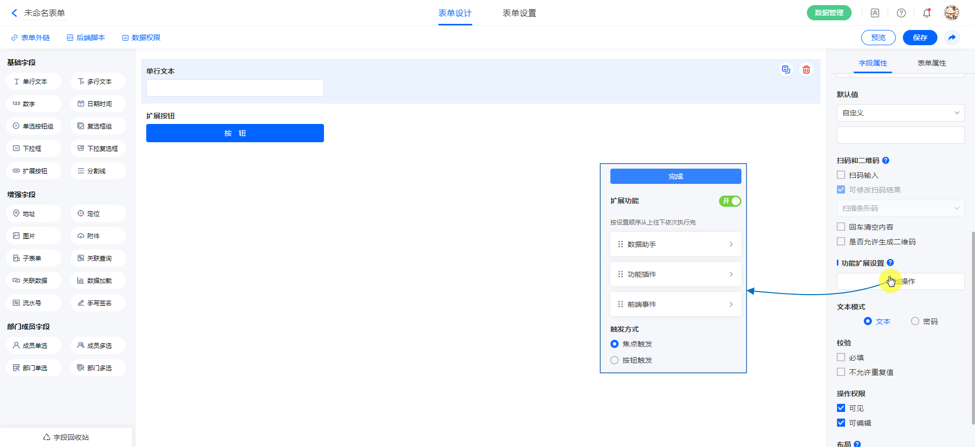 路径:【表单设计】>>>【选择目标控件】>>>【字段属性】>>>【功能扩展设置】>>>【功能插件】