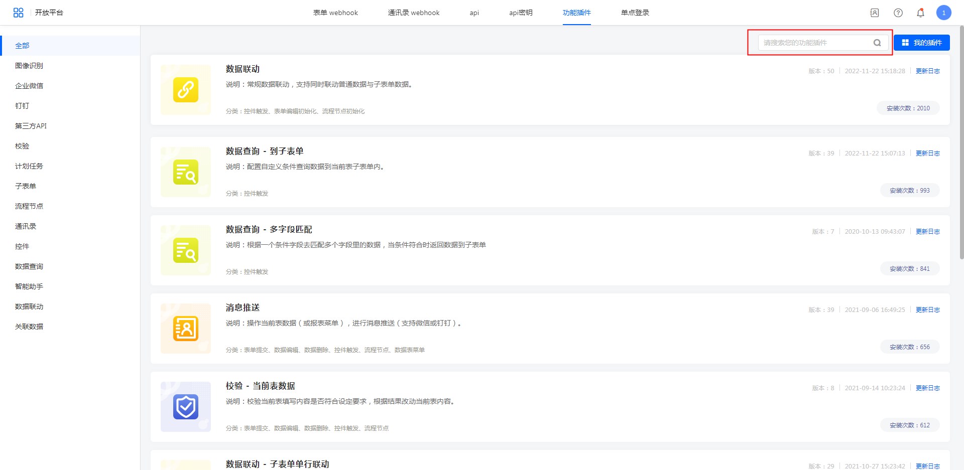 在页面上方搜索框中输入插件名称中的关键字,按回车键或点击右侧放大镜,即可实现插件查询。