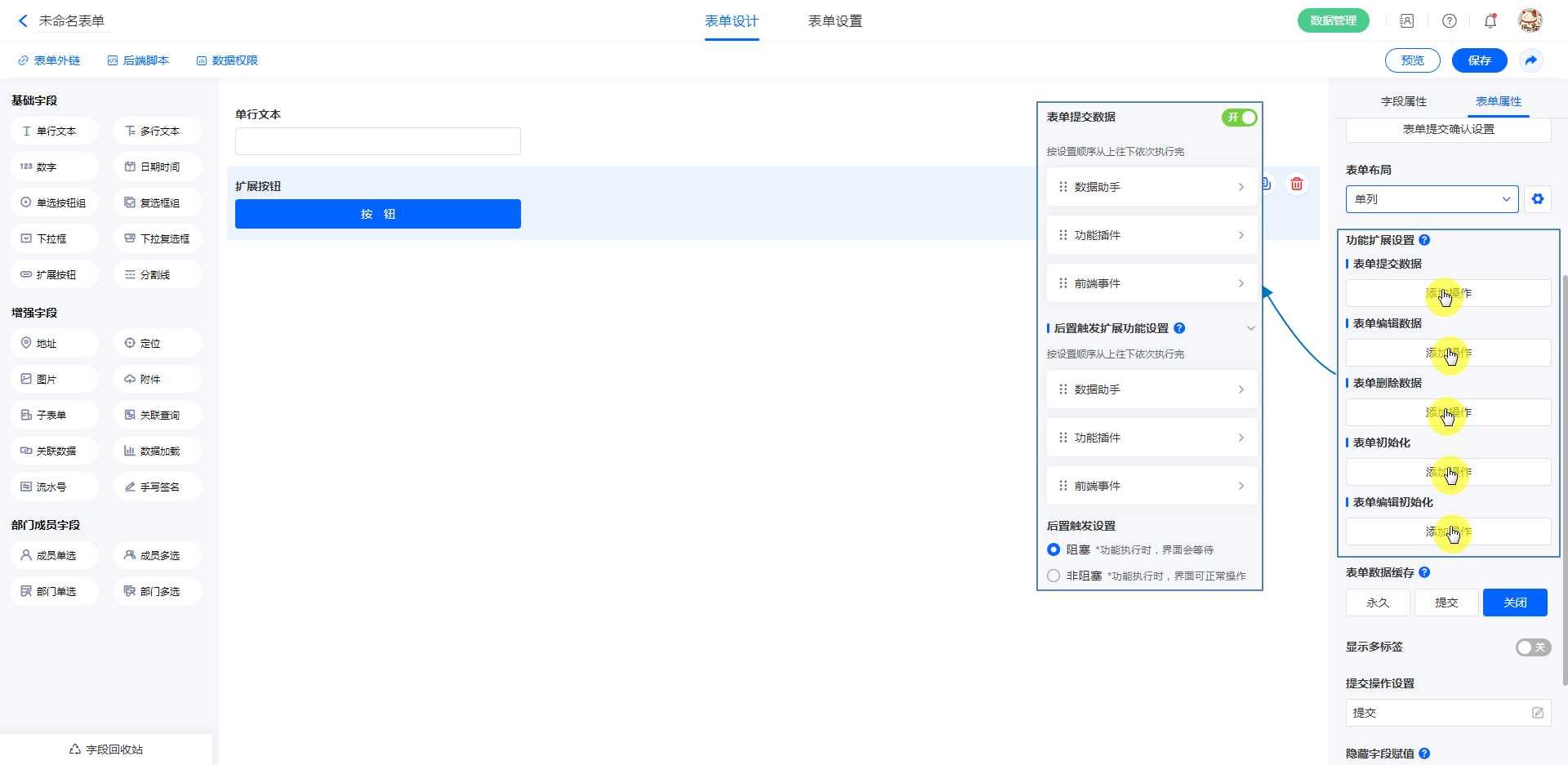 路径:路径:【表单设计】>>>【表单属性】>>>【功能扩展设置】>>>【表单操作类型】>>>【功能插件】