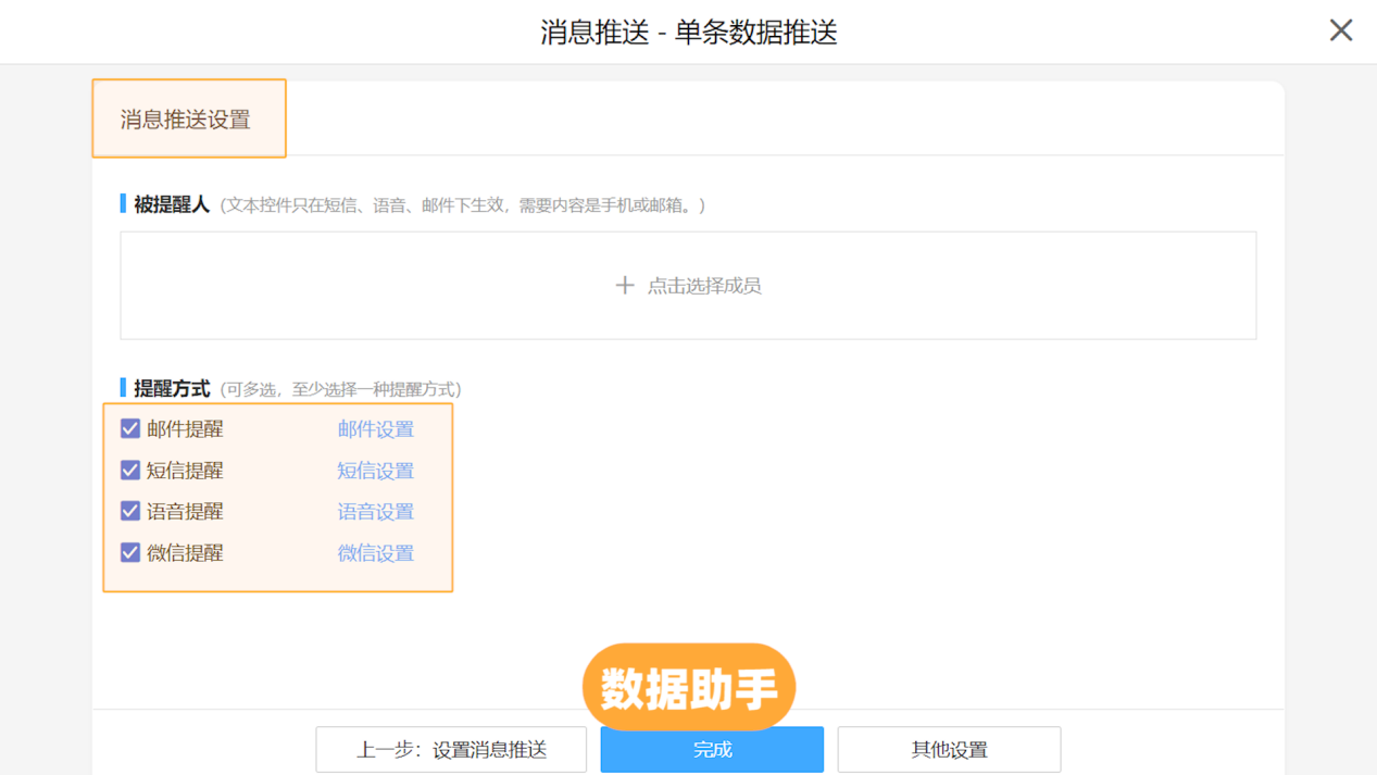 「推送提醒」可以设置指定时间/方式/数据/提醒人,即在什么时候、把哪些数据、用何种方式、提醒给谁,被提醒人可以设置成表单内的成员控件或部门控件,且可以设置重复周期,比如员工生日提醒一年提醒一次,被提醒人可以是行政部或人事部等。发送类型/对象/快慢皆自由设定,此外还可以自己填写提醒的文字内容,是一种完全由你掌控的提醒方式。