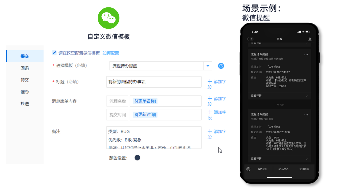 | 支持将需要的内容直接通过微信推送给对应的接收人,团队以微信作为日常工作流渠道时,可以选择使用“微信提醒”相关成员处理日常业务或工作流程中待办的事务。