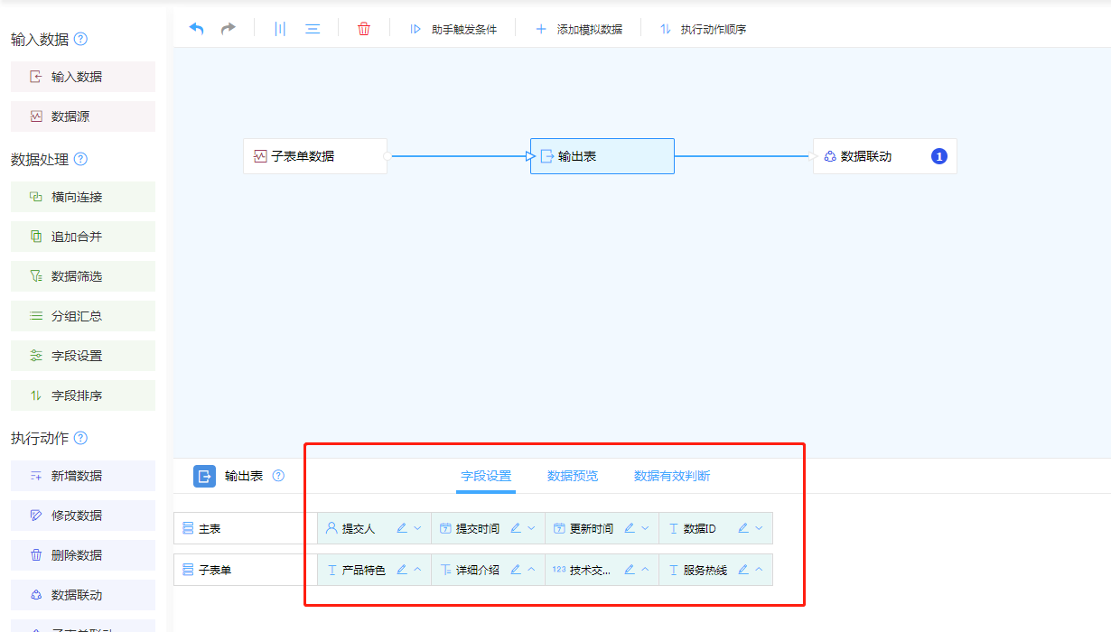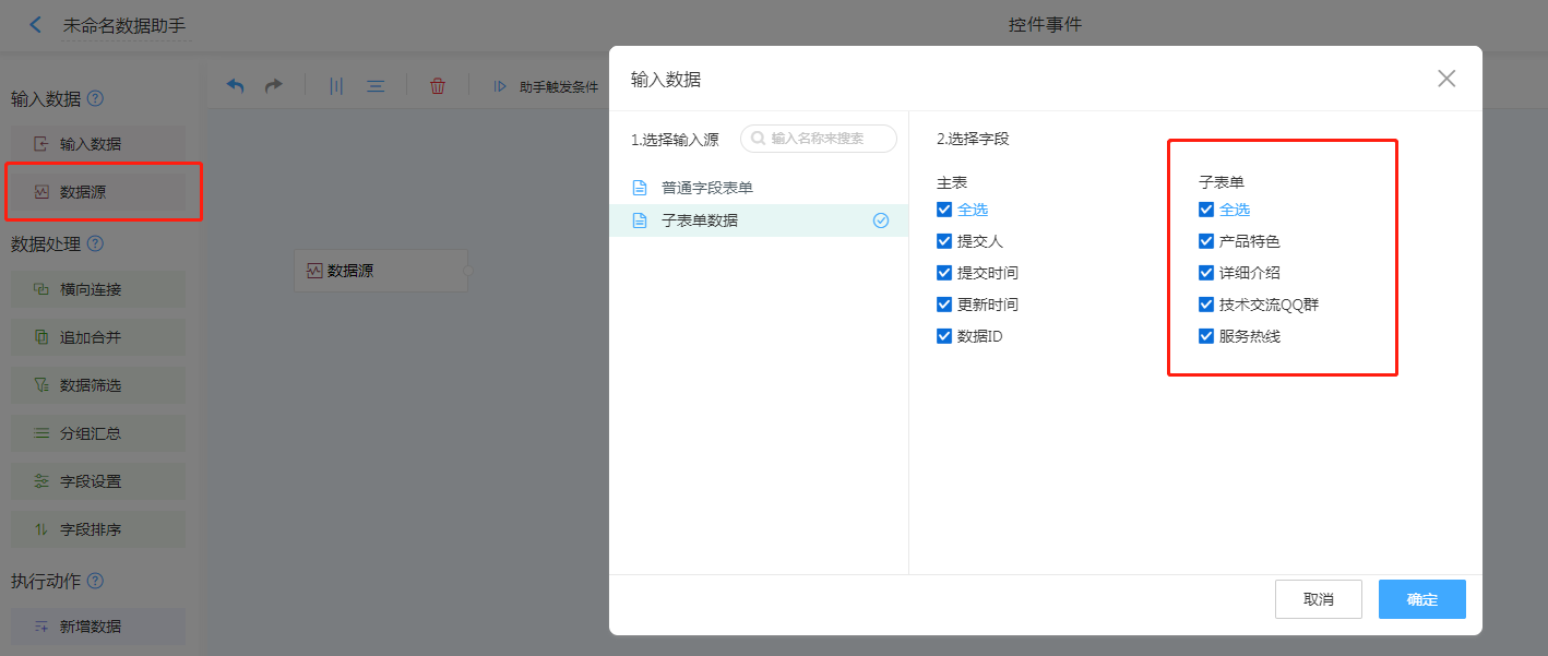 1. 输入数据选择数据源,并选择所需来源子表单中的字段