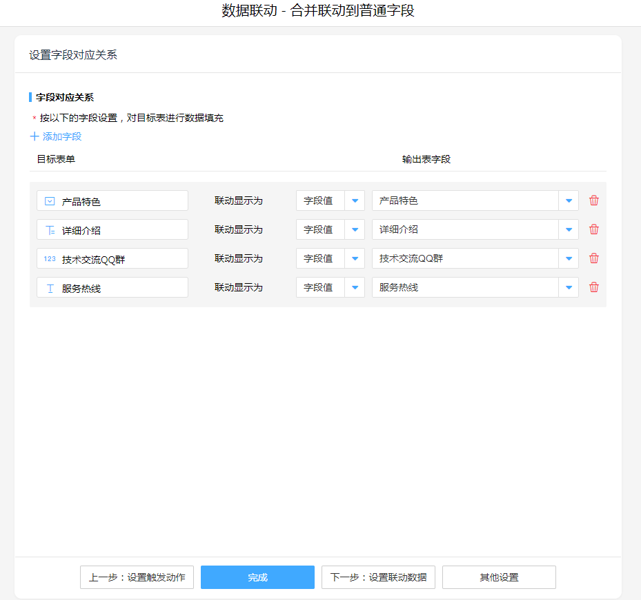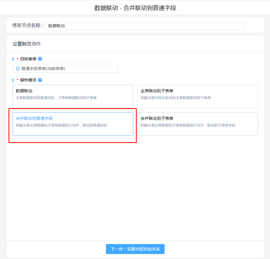 1. 添加执行动作数据联动,操作模式选择"合并联动到普通字段",设置字段对应关系。