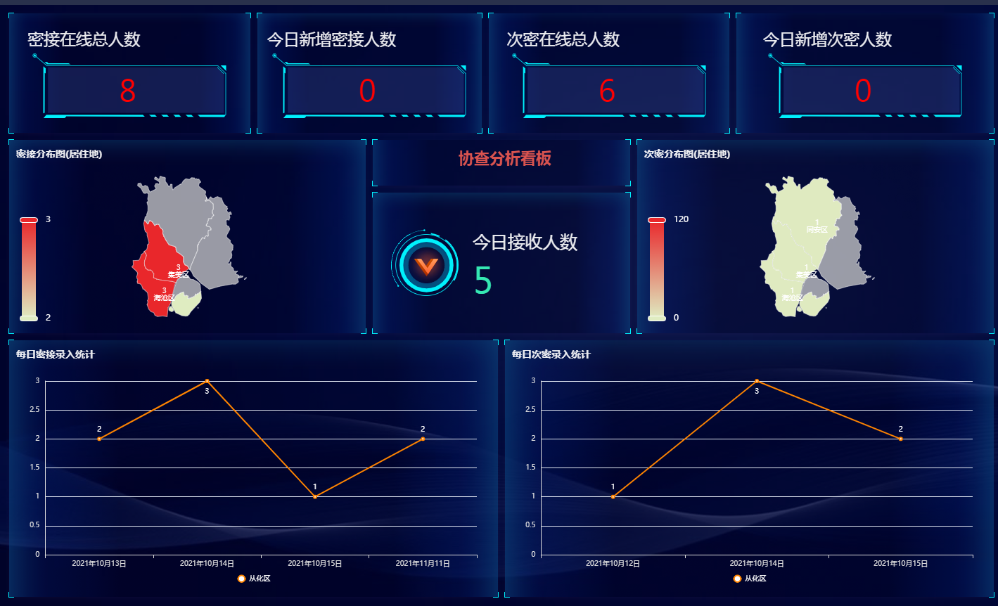 通过分析报表来展示每日新增病例人员的信息及走势图,同比、环比及区域对比的大数据展示。