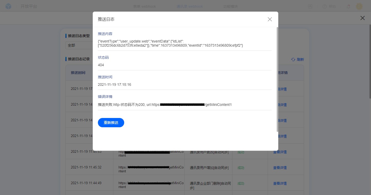 推送详情中可以查看到推送内容、状态码、推送时间、错误详情等信息,如果事件推送错误了还以在此处查看到具体信息。