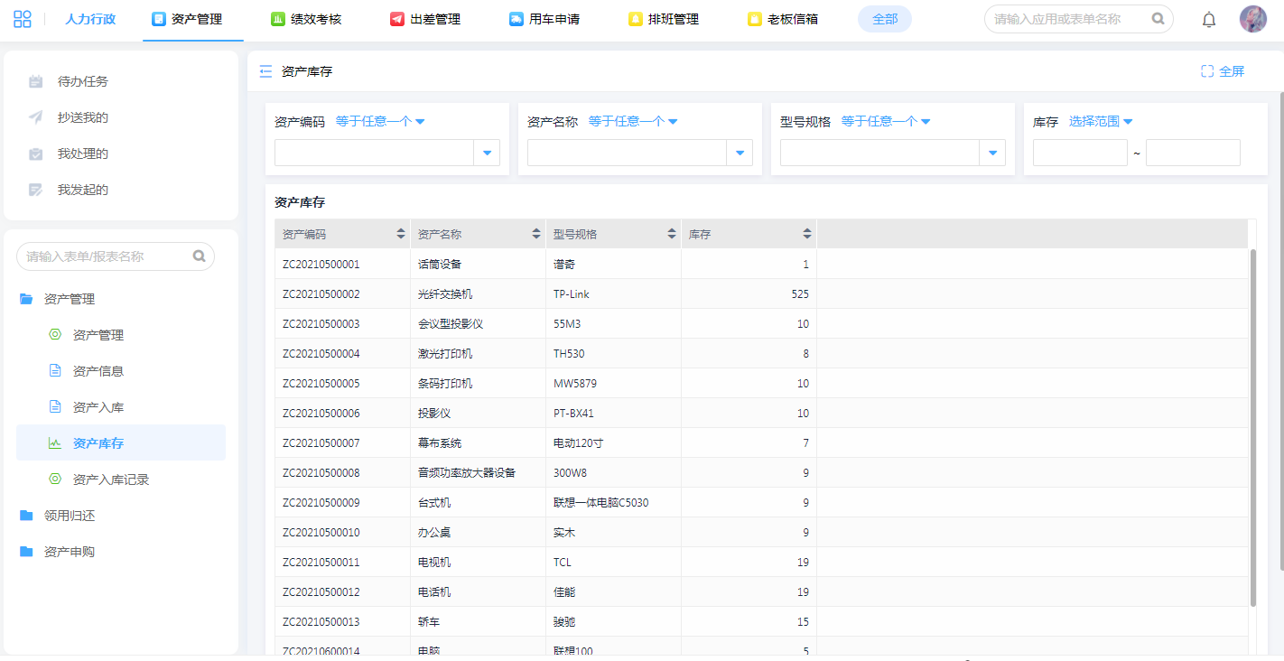 实现从申购、入库、领用、归还全过程跟进,为公司实现资产智能管理。