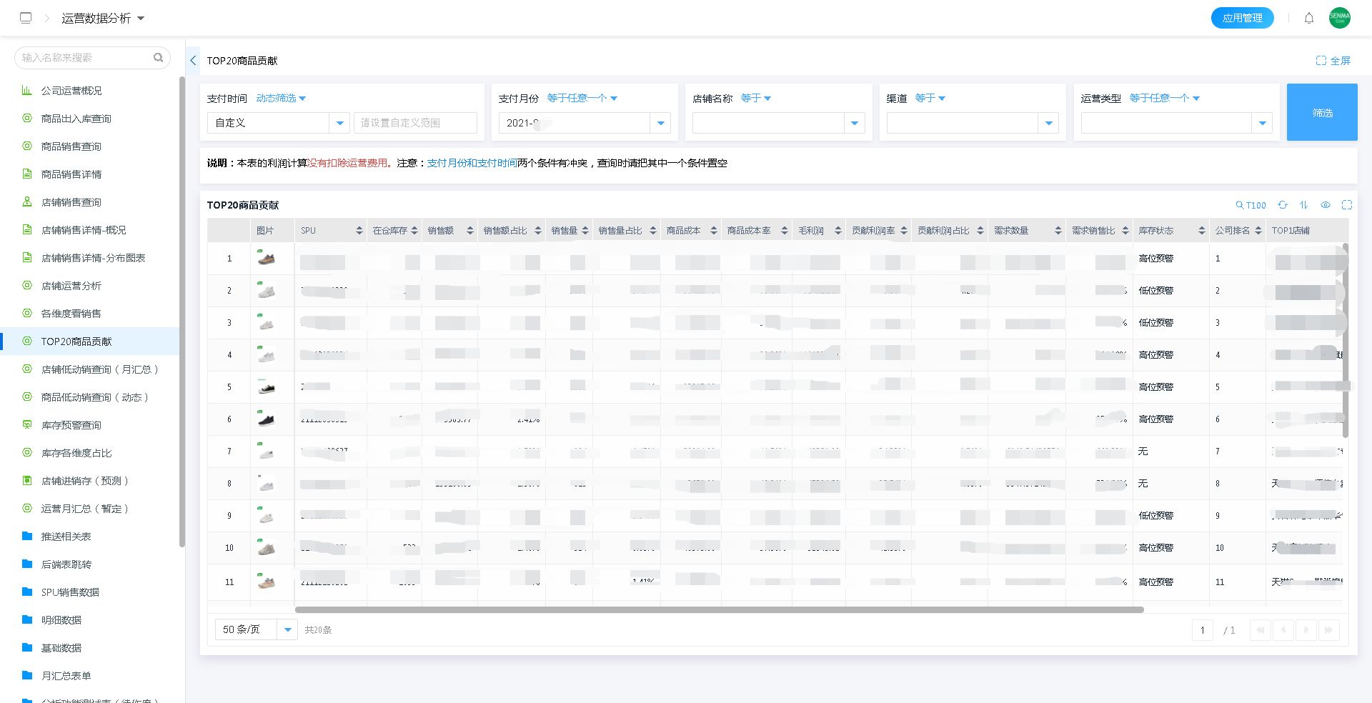 通过使用百数平台对数据强大的计算能力,对商品销售数据进行分析,在千万基础数据中计算出TOP20商品贡献的商品,有助于企业在后续的运营、推广等环节针对性的做出正确的决策。