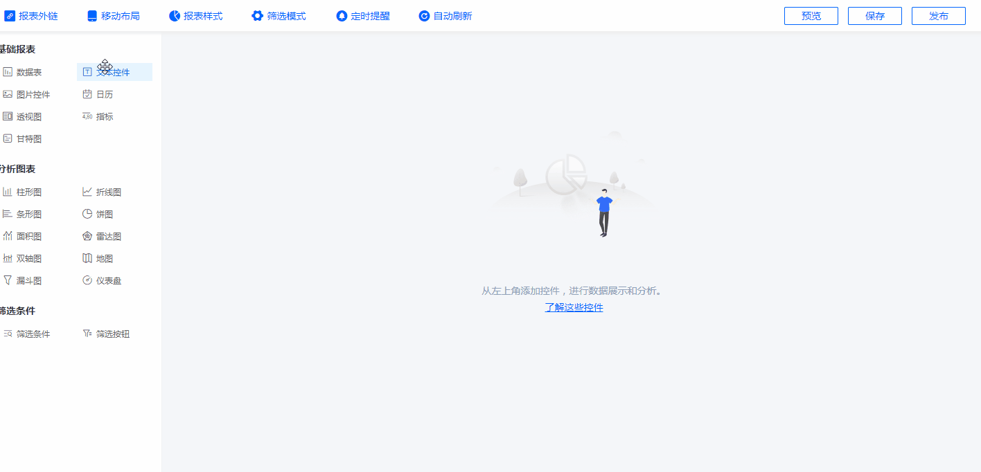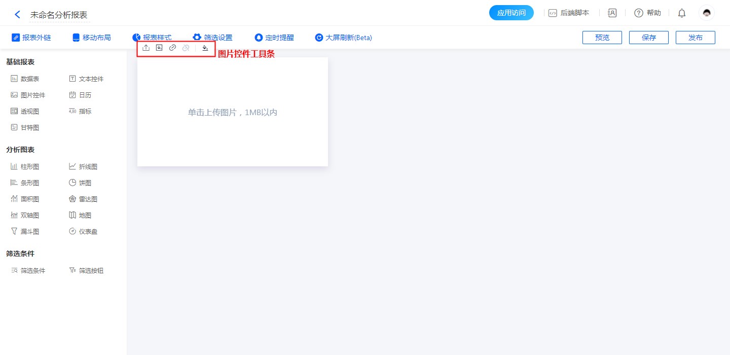 图片控件支持的样式设计工具包括:上传图片、填充方式、链接和取消链接、控件背景。