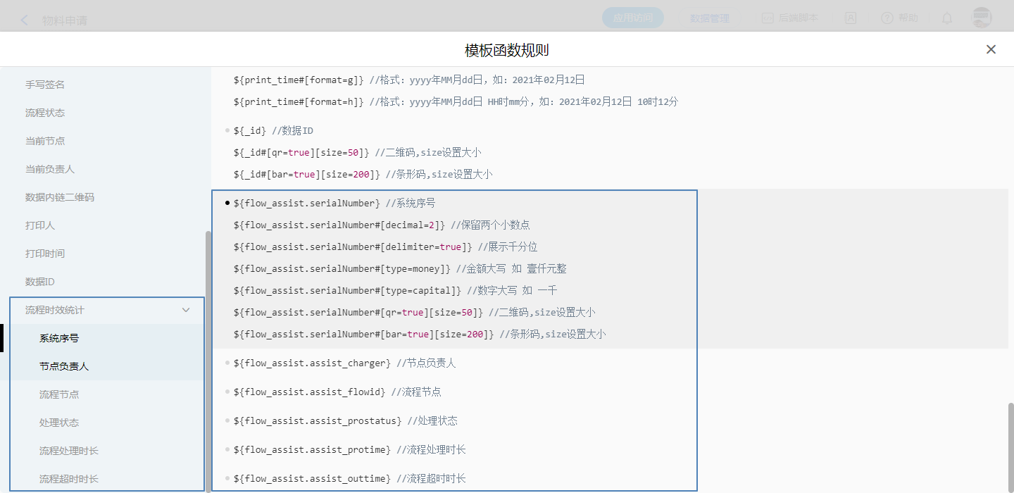 打印出的[流程时效统计]字段,其中[处理时长]和[超时时长]为动态格式。
