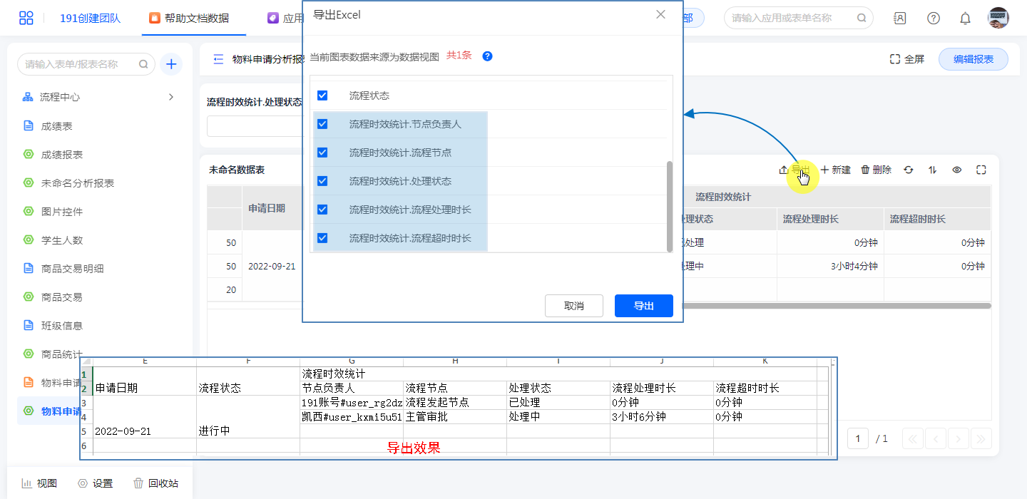 系统将[流程时效统计]作为一个系统子表单字段,在报表中可以查看并使用。