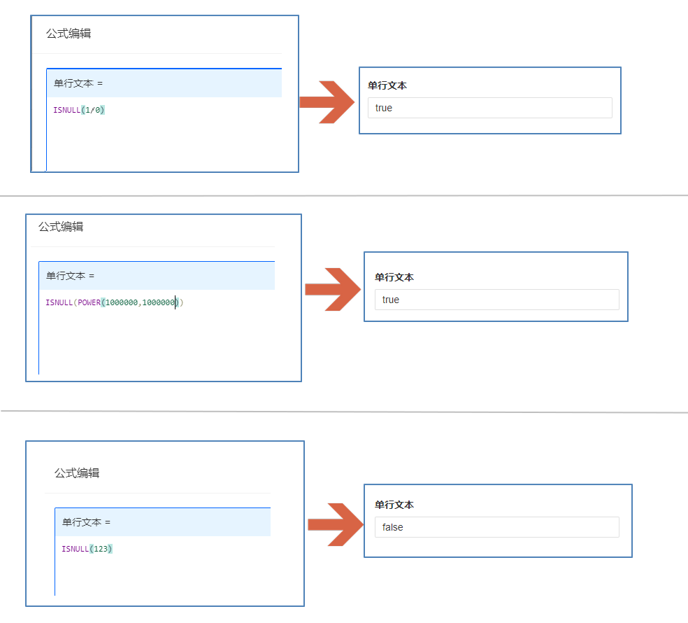 • ISNULL(value),表单公式返回值为true或false;视图/助手/数据管理公式返回值为1或0。