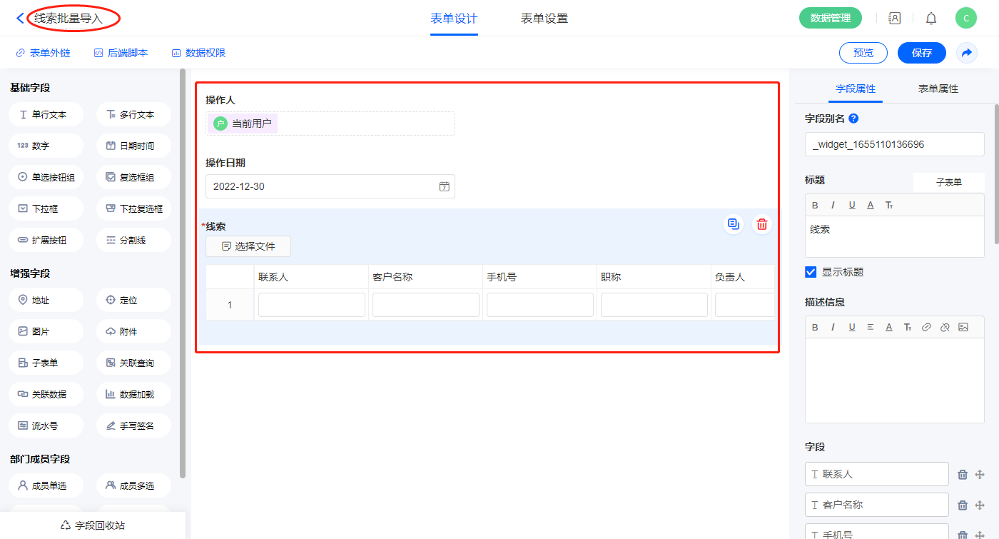 5)新增辅助表【线索批量导入】,字段设置如下;