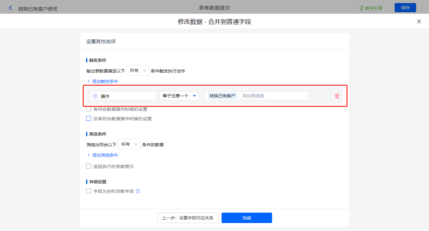 触发条件设置为当【操作】字段等于【转换已有客户】,则修改主表【线索状态】、【线索转换时间】、【负责人】字段的值;