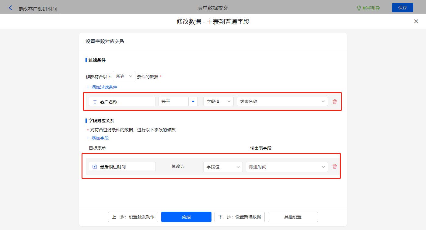 新增修改数据的执行动作,选择修改【新建线索】表单,选择对应过滤条件,以及需要修改的字段,设置好点击【完成】并保存该数据助手;