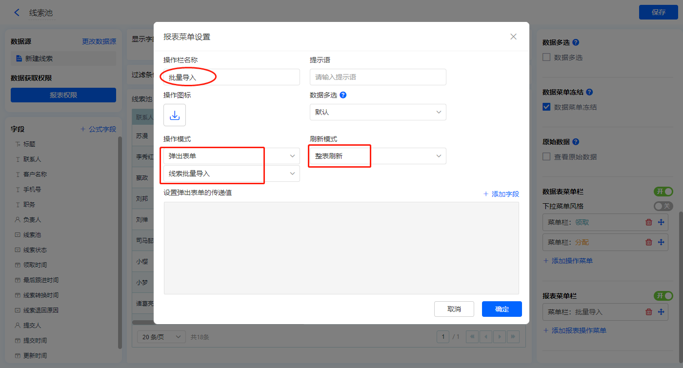 【批量导入】的报表菜单,操作模式设置为弹出辅助表单【线索批量导入】,并设置刷新模式为整表刷新;