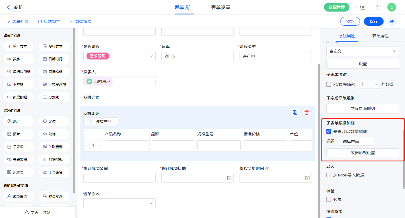 5)【商机明细】该子表单字段开启数据加载,更名为选择产品;