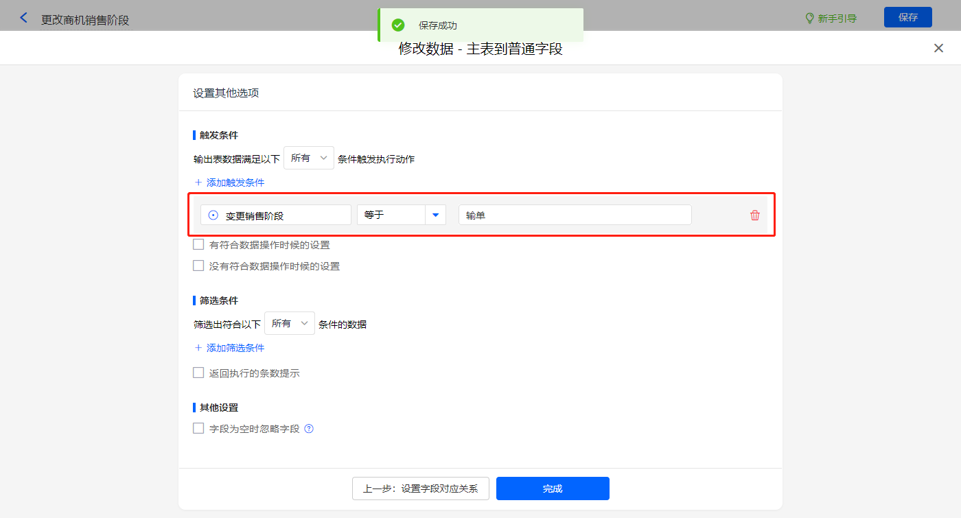 触发条件设置为当【变更销售阶段】字段等于【赢单】,则修改主表【销售阶段】、【阶段变更时间】、【阶段类型】三个字段的值;