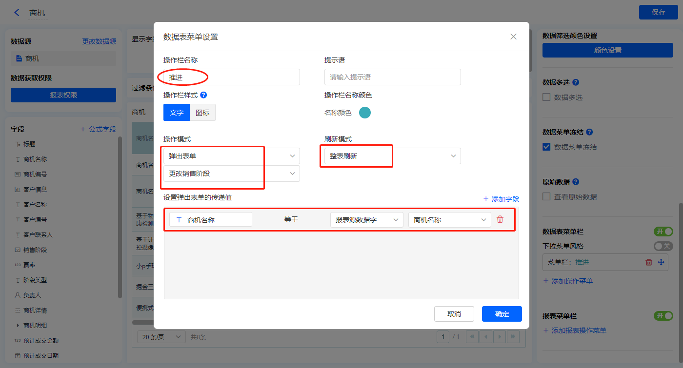 【推进】的菜单栏,操作模式设置为弹出辅助表单【更改销售阶段】,并设置刷新模式为整表刷新,设置表单传递值,点击【确认】;
