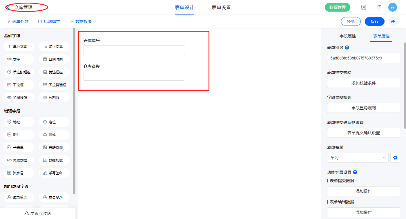 3)【仓库】字段,选择设置为关联其他表单数据,关联仓库管理的【仓库名称】字段;