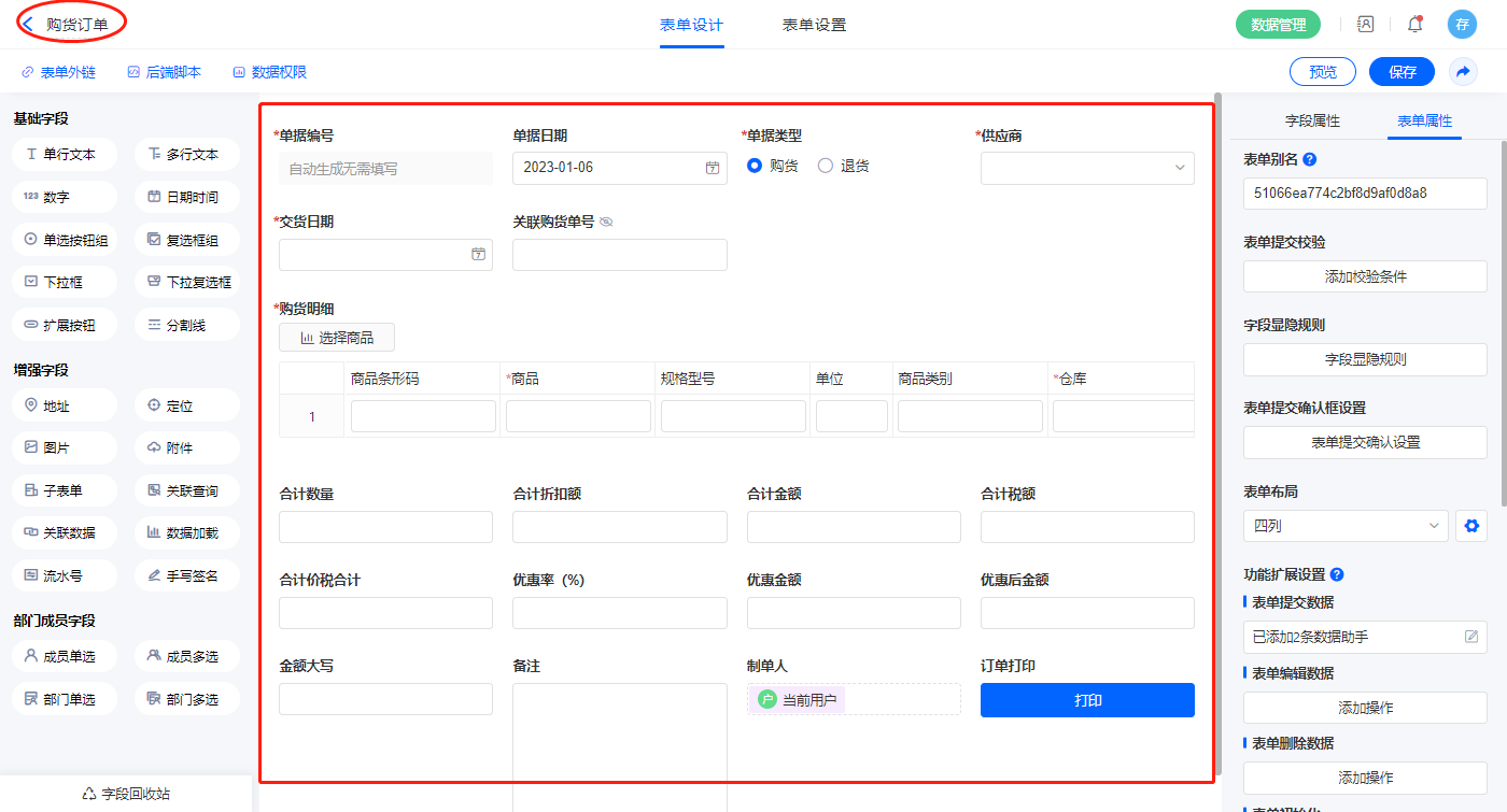 3)该表单是流程表单,设置流程节点审核,该节点属性的节点权限提交设置一条数据助手,名称为修改购货单状态;