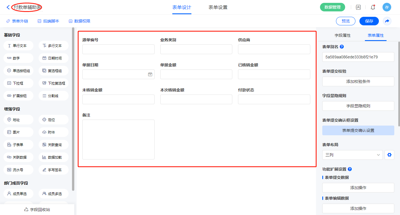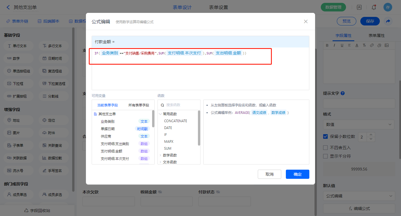 【付款金额】字段设置默认值为公式编辑,设置公式:“IF(业务类别=="支付销售/采购费用",SUM(支付明细.本次支付),SUM(支出明细.金额))”;