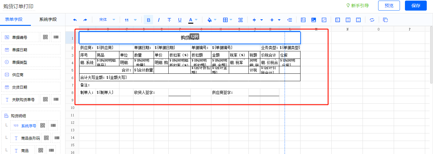 1)【购货入库明细.可用库存】、【购货入库明细.购货单价】、【购货入库明细.含税单价】、【购货入库明细.折扣额】、【购货入库明细.金额】、【购货入库明细.税率(%)】、【购货入库明细.税额】、【购货入库明细.价税合计】、【购货入库明细.价税合计】、【合计数量】、【合计折扣额】、【合计金额】、【合计税额】、【合计价税合计】以上字段如2.2设置公式;