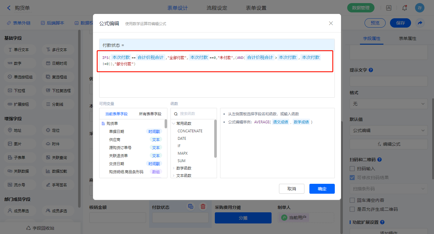 选择【付款明细.付款状态】字段,设置默认值为公式编辑,设置公式:“IFS(付款明细.已核销金额(辅助)付款明细.单据金额,"全部付款",付款明细.已核销金额(辅助)0,"未付款",(AND(付款明细.单据金额>付款明细.已核销金额(辅助),付款明细.已核销金额(辅助)!=0)),"部分付款")”;