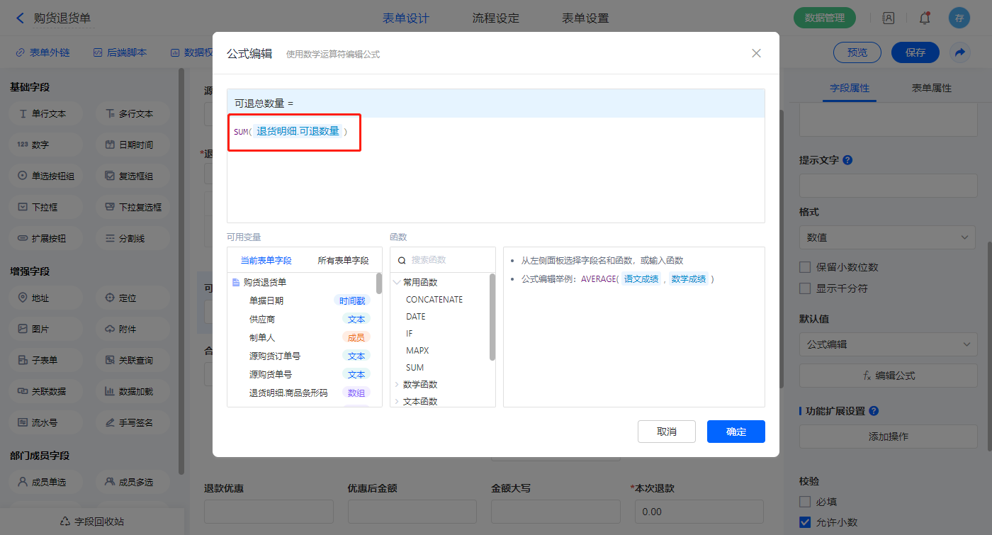 1)【退货明细.可用库存】、【退货明细.购货单价】、【退货明细.含税单价】、【退货明细.折扣额】、【退货明细.金额】、【退货明细.税率(%)】、【退货明细.税额】、【退货明细.价税合计】、【退货明细.价税合计】、【合计数量】、【合计折扣额】、【合计金额】、【合计税额】、【合计价税合计】、【优惠金额】、【优惠后金额】、【金额大写】、【商品统计】、【总采购费用】以上字段如2.2设置公式;选择【可退总数量】字段,设置默认值为公式编辑,如图设置公式;