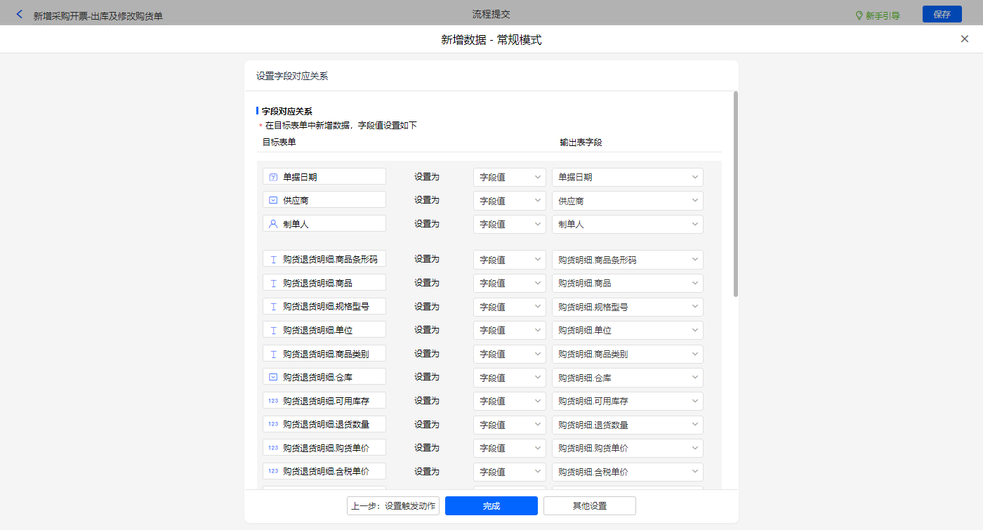 其他设置触发条件为【源购货单号】不为空,设置好点击【完成】并保存该数据助手;
