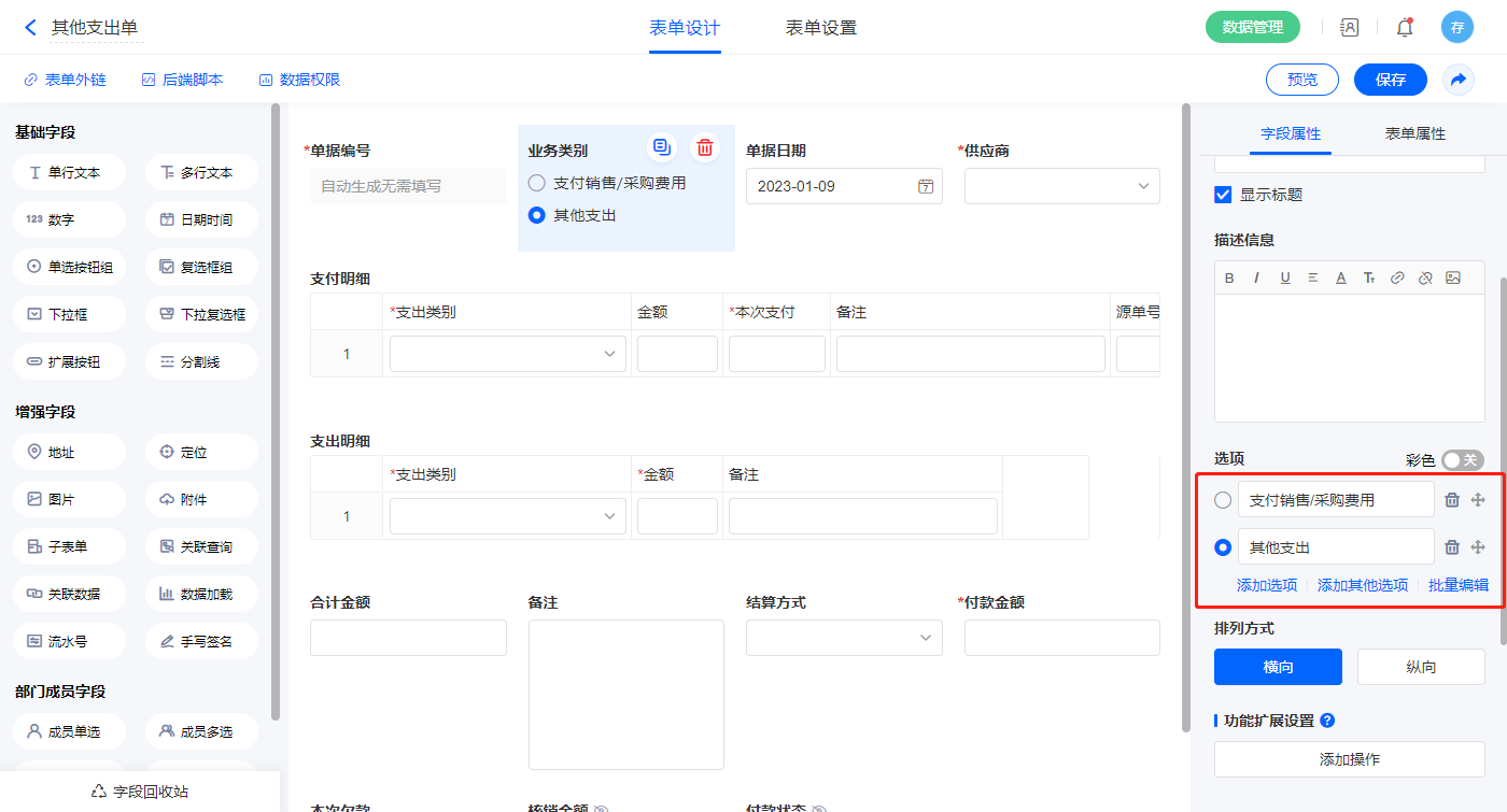 1)选择【业务类别】字段,输入选项,并设置默认值为其他支出;